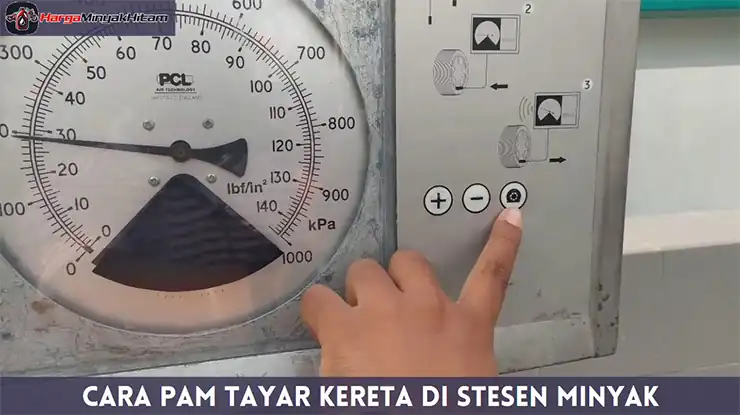 Langkah seterusnya ialah menetapkan tekanan angin pada pam di stesen minyak. Ini dilakukan dengan menggunakan butang pada meter pam angin.